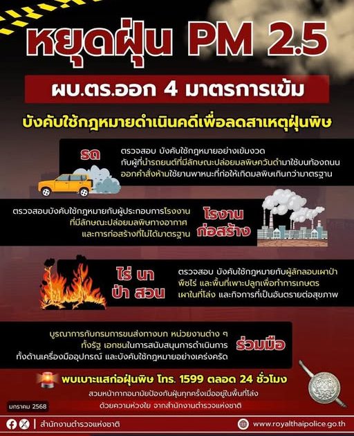 พล.ต.อ.กิตติ์รัฐ พันธุ์เพ็ชร์ ผบ.ตร. สั่งการตำรวจทุกหน่วยเพิ่มมาตรการเข้ม ตรวจสอบ และ บังคับใช้กฎหมายเพื่อลดสาเหตุการก่อฝุ่นละลองขนาดเล็ก PM 2.5 ซึ่งเป็นอันตรายต่อสุขภาพประชาชน
