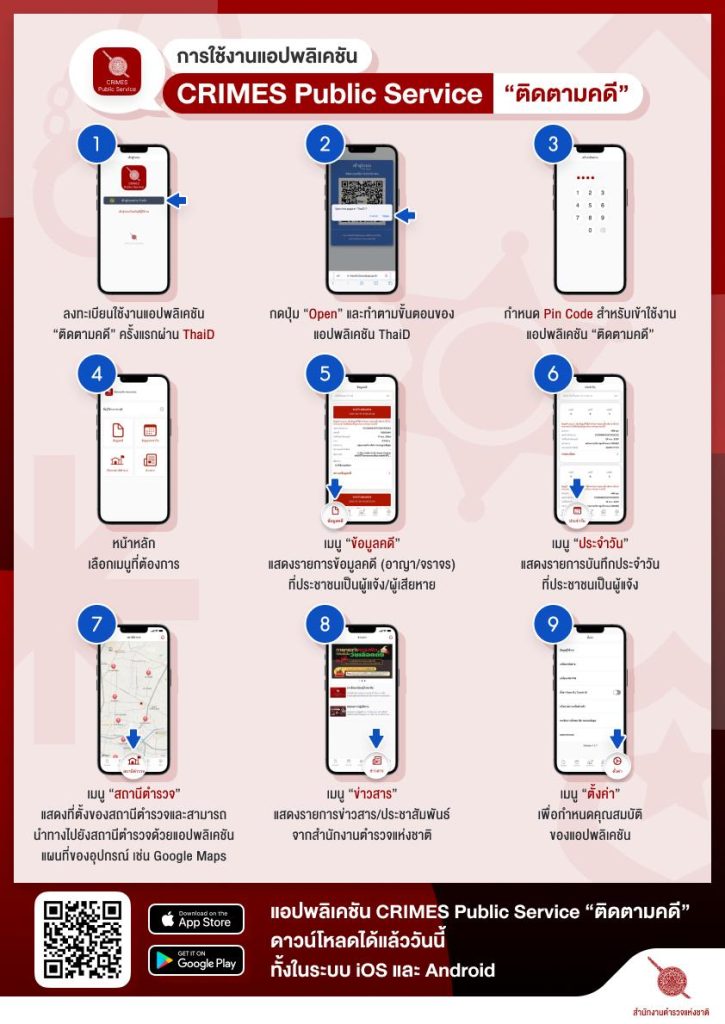 ประชาสัมพันธ์แอปพลิเคชัน “ติดตามคดีภาคประชาชน” Crimes Public Service สำหรับใชับริการบนระบบปฏิบัติการ Android ผ่านทาง Play Store และระบบปฏิบัติการ iOS ผ่านทาง App Srore ให้ประชาชนผู้มาติดต่อราชการทราบ