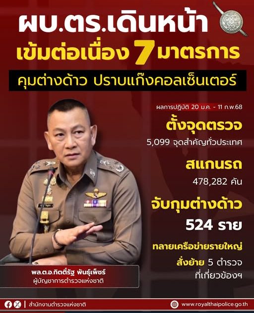 เมื่อวันที่ 12 กุมภาพันธ์ 2568 พล.ต.ท.อาชยน ไกรทอง โฆษกสำนักงานตำรวจแห่งชาติ เปิดเผยว่า หลังจากที่ พล.ต.อ.กิตติ์รัฐ พันธุ์เพ็ชร์ ผู้บัญชาการตำรวจแห่งชาติ (ผบ.ตร.) ได้กำหนด 7 มาตรการคุมเข้มแก้ไขปัญหาคนต่างด้าวลักลอบเข้าเมือง ถูกหลอกลวง หรือประกอบธุรกิจผิดกฎหมาย และอาชญากรรมข้ามชาติ แก๊งคอลเซ็นเตอร์ ให้ทุกหน่วยดำเนินการอย่างจริงจังให้เห็นผลเป็นรูปธรรม จับต้องได้ มีผลงานออกมาสู่สายตาพี่น้องประชาชน สร้างความเชื่อมั่นให้นักท่องเที่ยวตามนโยบายรัฐบาล พบว่าตั้งแต่วันที่ 20 มกราคม ถึง 11 กุมภาพันธ์ 2568 มีผลการปฏิบัติที่สำคัญตาม 7 นโยบายของ ผบ.ตร. ในทุกด้าน ดังนี้