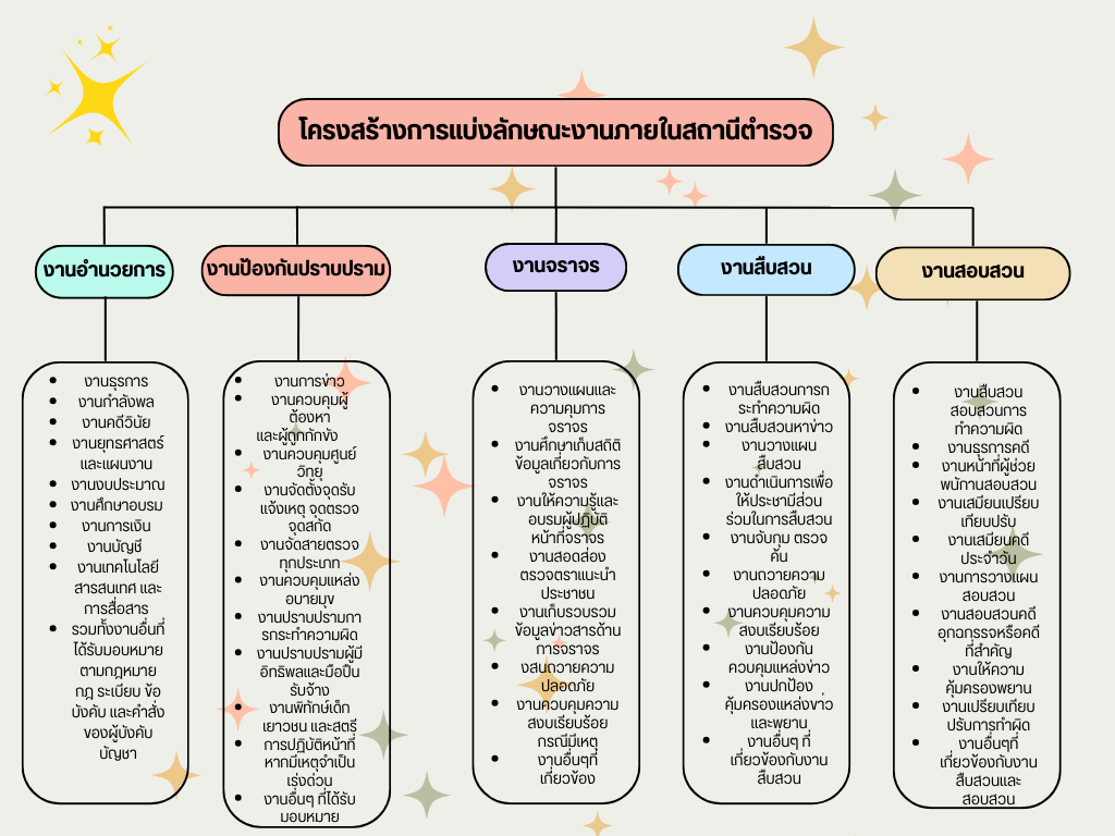 มีหน้าที่เกี่ยวกับการอำนวยการ การวางแผน การตรวจสอบติดตามและประเมินผลงานที่เกี่ยวกับนโยบาย ยุทธศาสตร์ และแผนงานของสถานีตำรวจ งานการบริหารบุคลากร งานจเรตำรวจ งานกิจการพิเศษ งานความมั่นคง การศึกษาการฝึกอบรม งานวิชาการ สวัสดิการ การพัฒนา การบริหารจัดการ งบประมาณ การเงิน การพัสดุ การพลาธิการและ สรรพวุธ การส่งกำลังบำรุง รวมทั้งลักษณะงานอื่นๆ ที่เกี่ยวข้องหรือเป็นส่วนประกอบของงานดังกล่าว เพื่อส่งเสริมหรือสนับสนุนการปฏิบัติงานของสถานีตำรวจ
