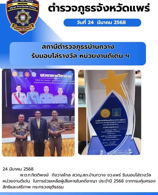 งันที่ 24 มี.ค. 68 พ.ต.ท.กิตติพงษ์ กังวาลไกล สวญ.ฯ ได้รับมอบโล่รางวัลหน่วยงานดีเด่น ในการช่วยเหลือผู้เสียหายในคดีอาญา ประจำปี 2568 จากกรมคุ้มคองสิทธิเสรีภาพ กระทรวงยุติธรรม