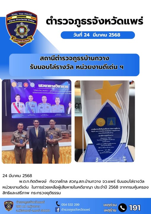 งันที่ 24 มี.ค. 68 พ.ต.ท.กิตติพงษ์ กังวาลไกล สวญ.ฯ ได้รับมอบโล่รางวัลหน่วยงานดีเด่น ในการช่วยเหลือผู