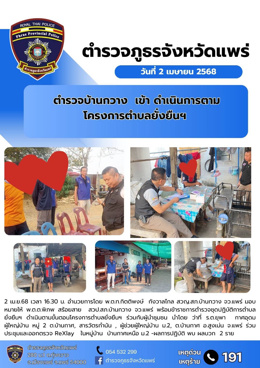 วันนี้ 2 เม.ย.68 อำนวยการโดย พ.ต.ท.กิตติพงษ์ กังวาลไกล สวญ.ฯ มอบหมายให้ พ.ต.ต.พิภพ สร้อยสาย สวป.ฯ พร
