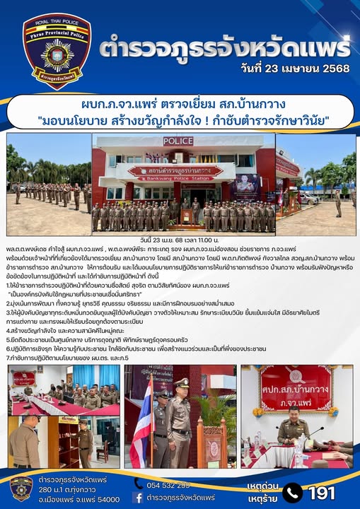 ผบก.ภ.จว.แพร่ ตรวจเยี่ยม สภ.บ้านกวาง “มอบนโยบาย สร้างขวัญกำลังใจ ! กำชับตำรวจรักษาวินัย”