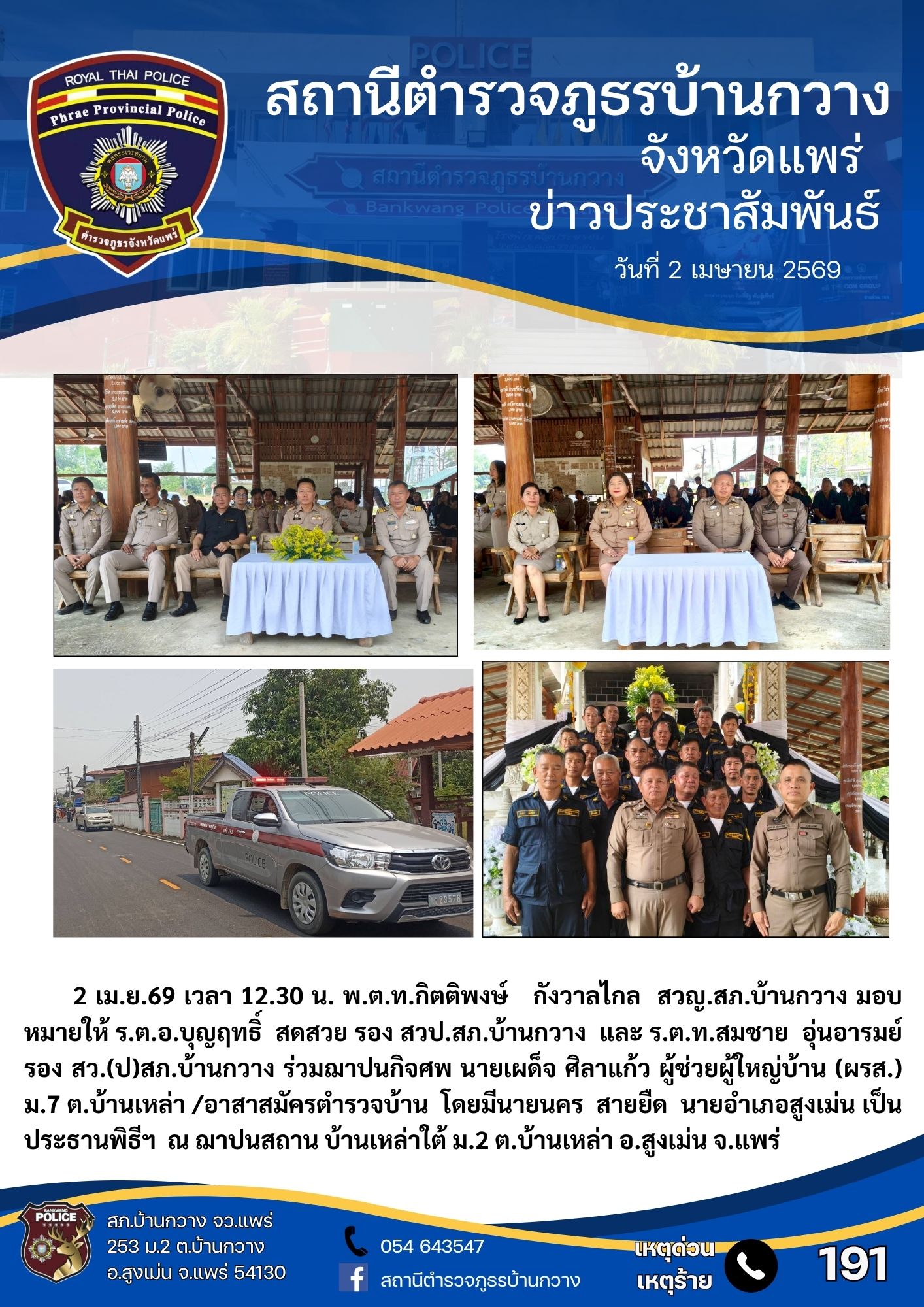 วันที่ 2 เม.ย.69 เวลา 12.30น. โดยการอำนวยการของ พ.ต.ท.กิตติพงษ์ กังวาลไกล สวญ.ฯ มอบหมายให้ ร.ต.อ.บุญ